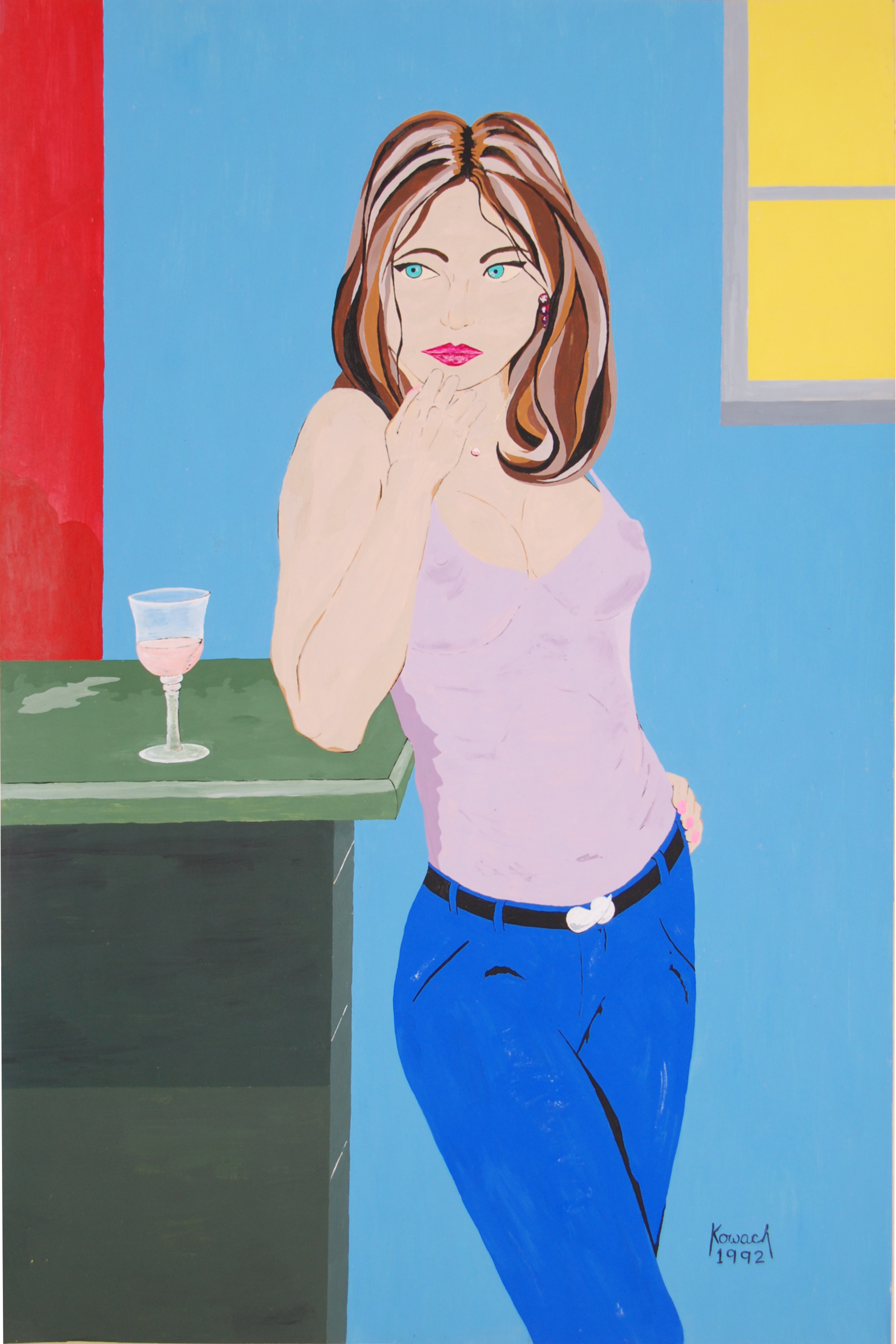 This drawing did not have a model but was inspired by the many times I have been in bars in my youth. This piece was part of my experiment to create “Nagel” like images, which were popular at the time. Betty scans the bar with her piercing blue eyes looking for the right match for her casual elegance and sex appeal.