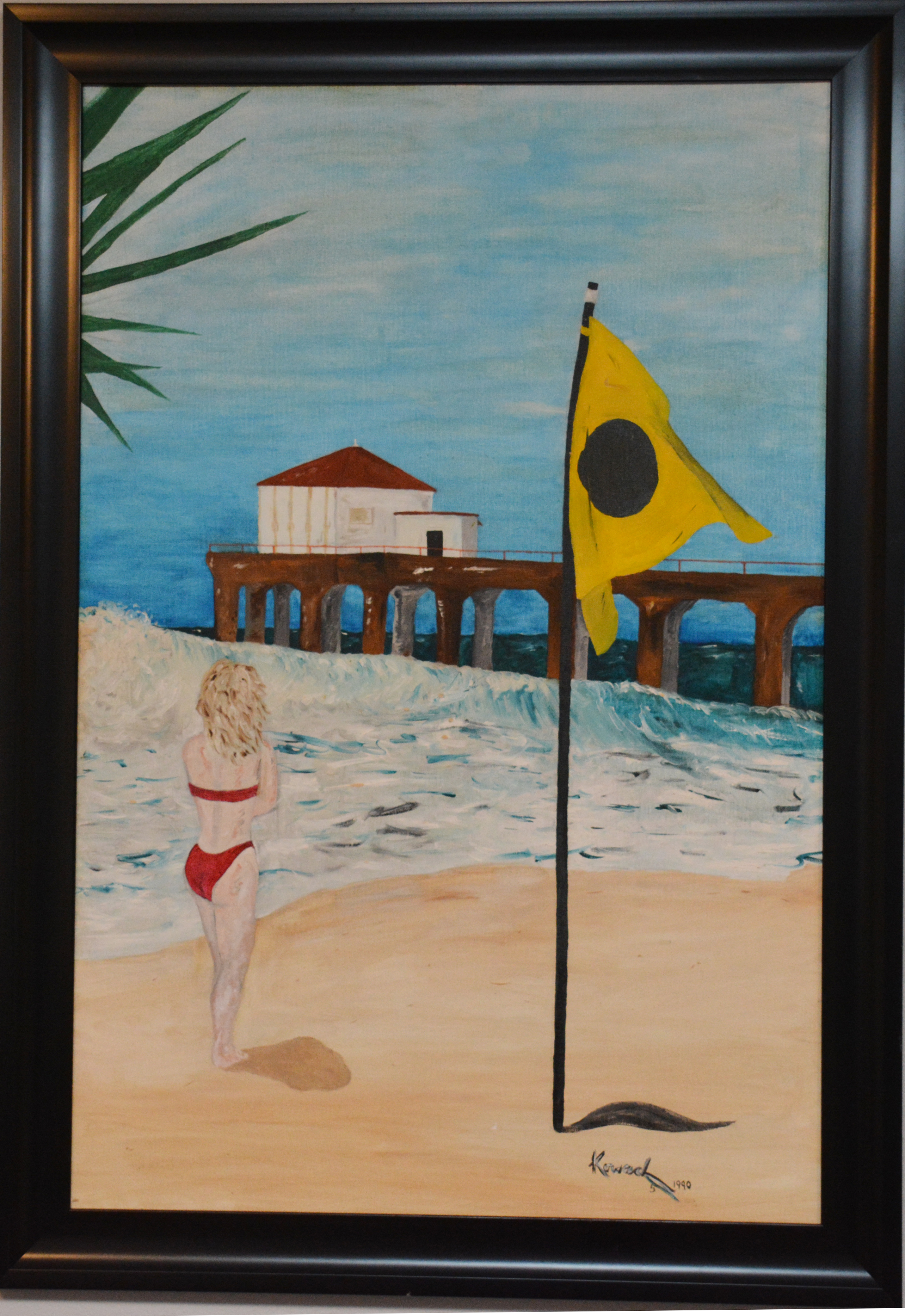 A chilly day after a storm with tides dangerously high signaling caution for surfers.The old pier at Manhattan Beach, Ca. sits in the background. No swimming today. The Black Ball Flag indicates high surf or dangerous current, Surfboards and other non-powered watercraft are prohibited.